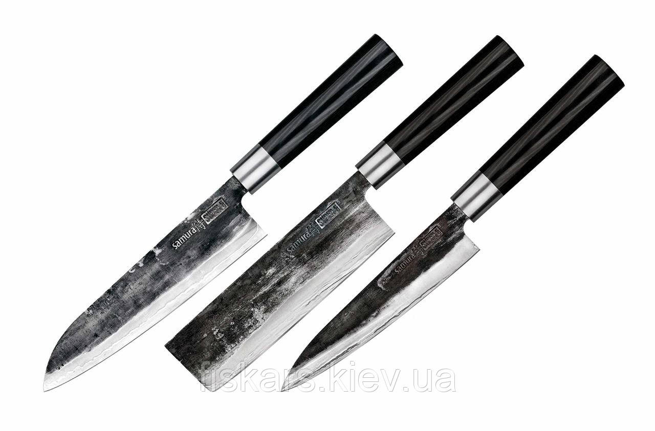 До складу набору входить універсальний ніж (162 мм), ніж накірі (171 мм) та ніж сантоку (182 мм).